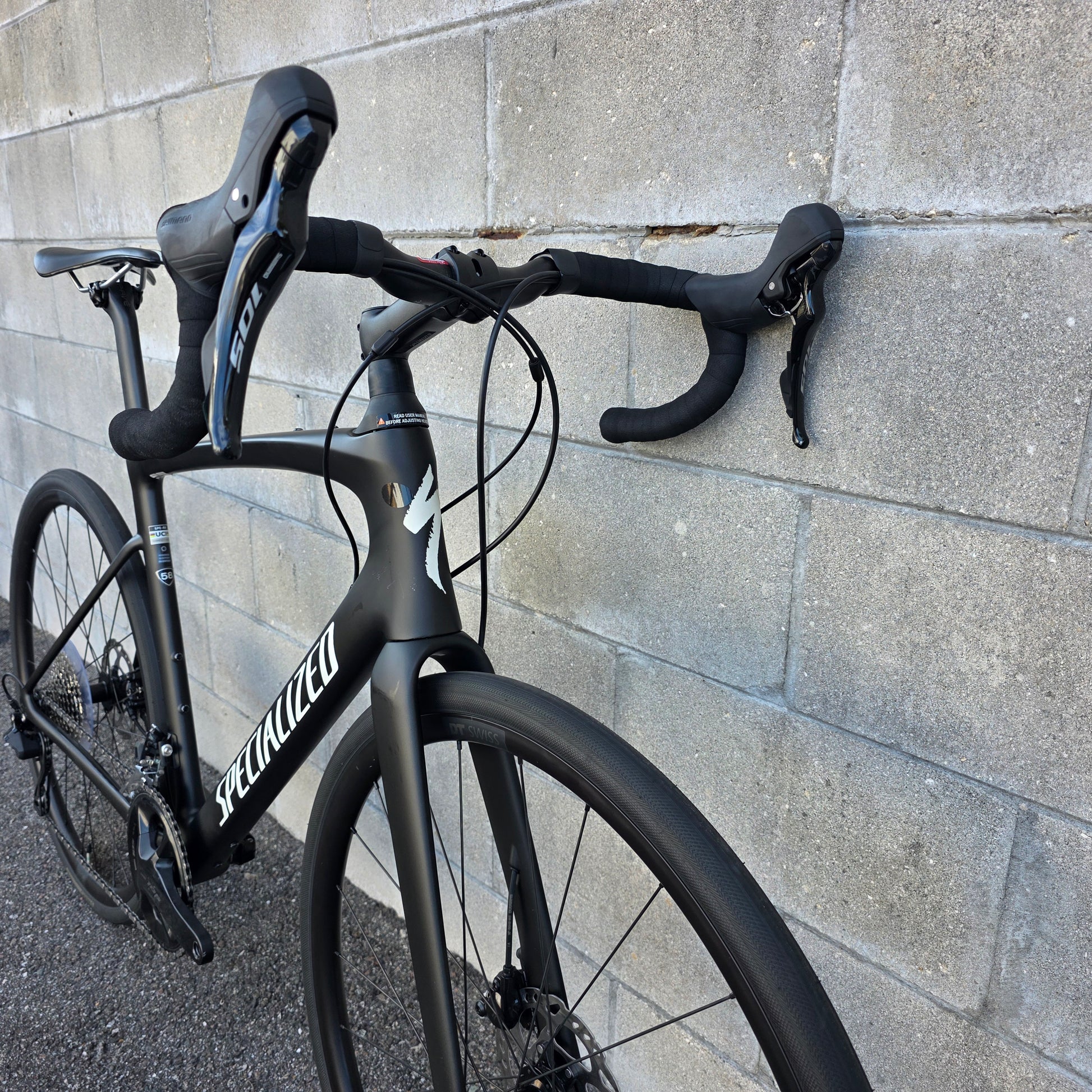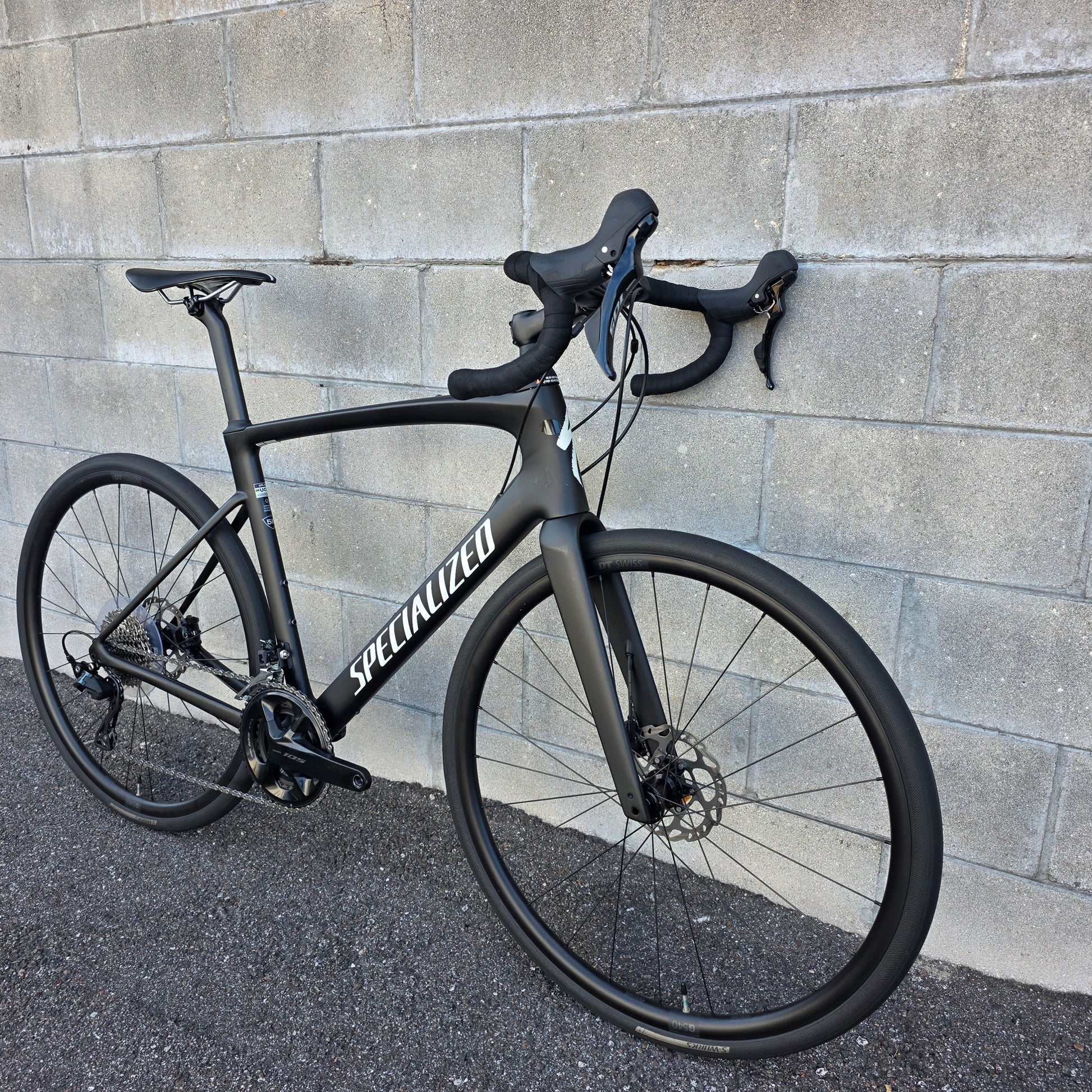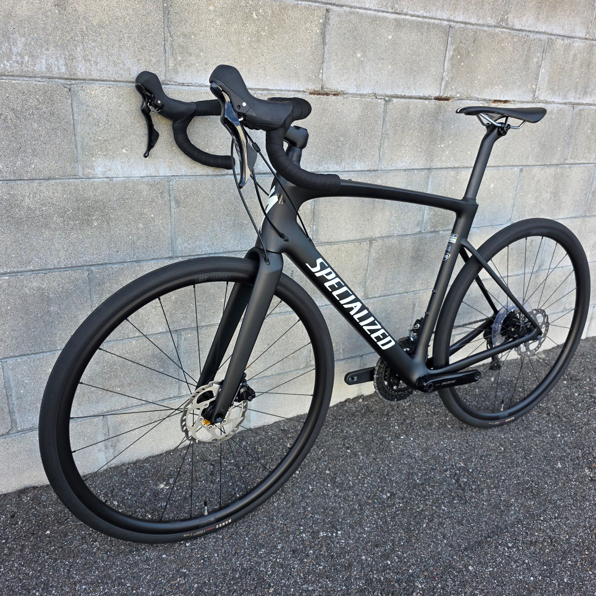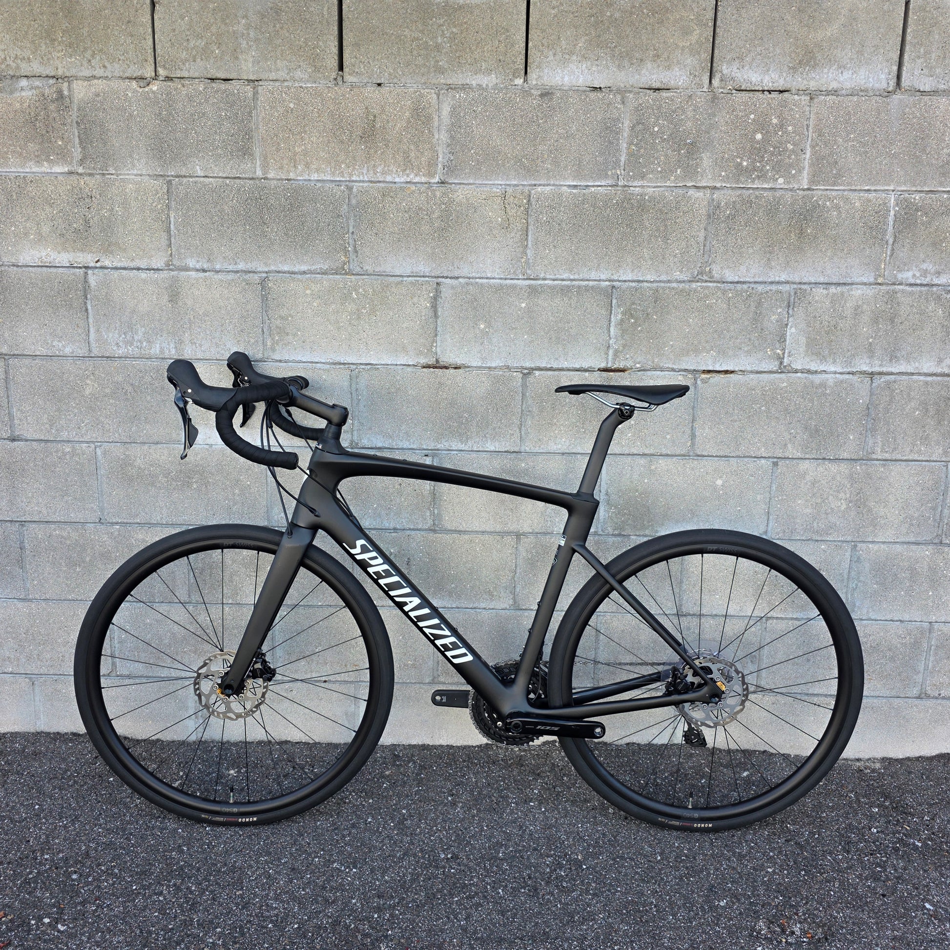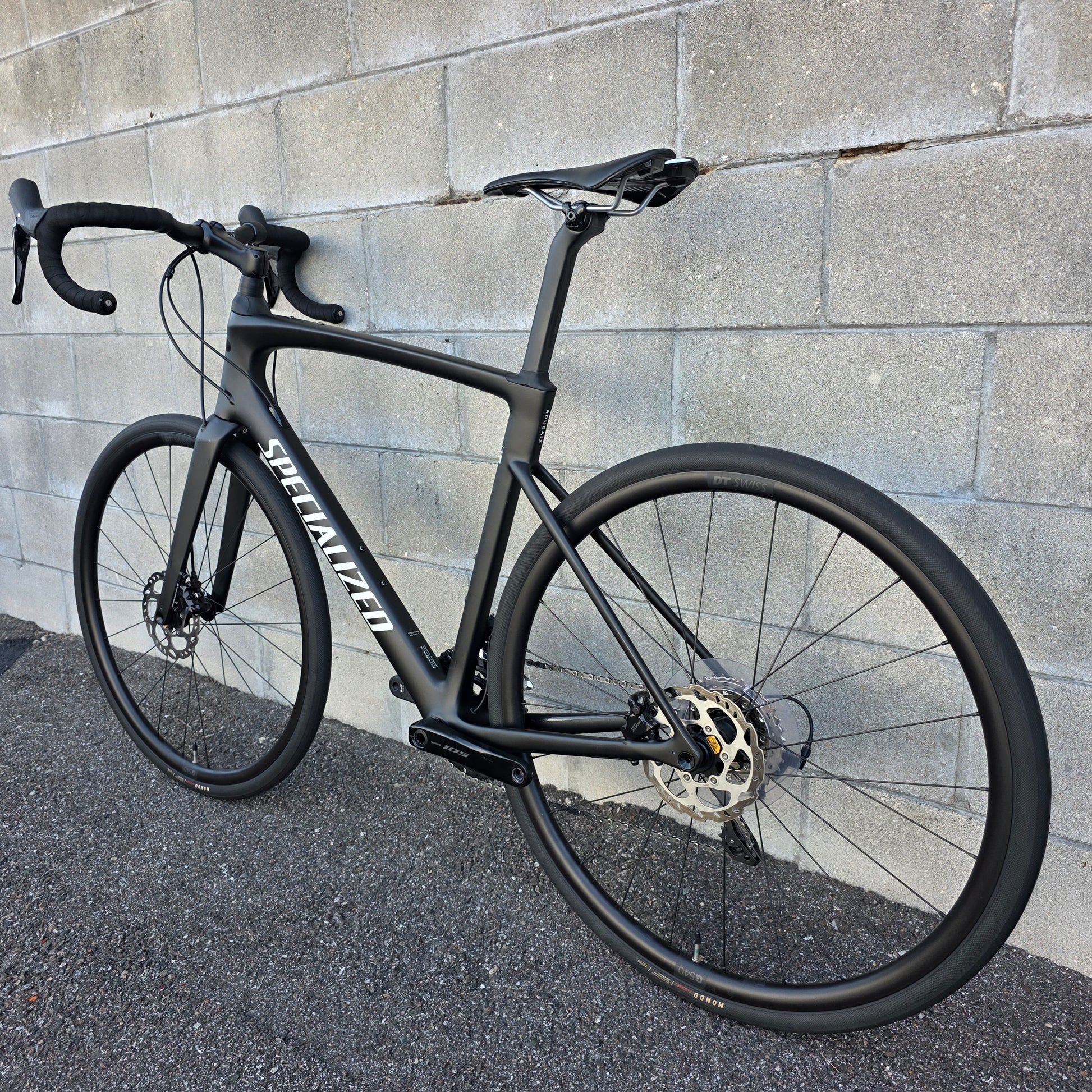 Shimano 105 groupset 12 speed, 50/34 cranks, 11-36 cassette, hydraulic brakes, Specialized Hover drop bars with rise, S-works Mondo 32c tires.