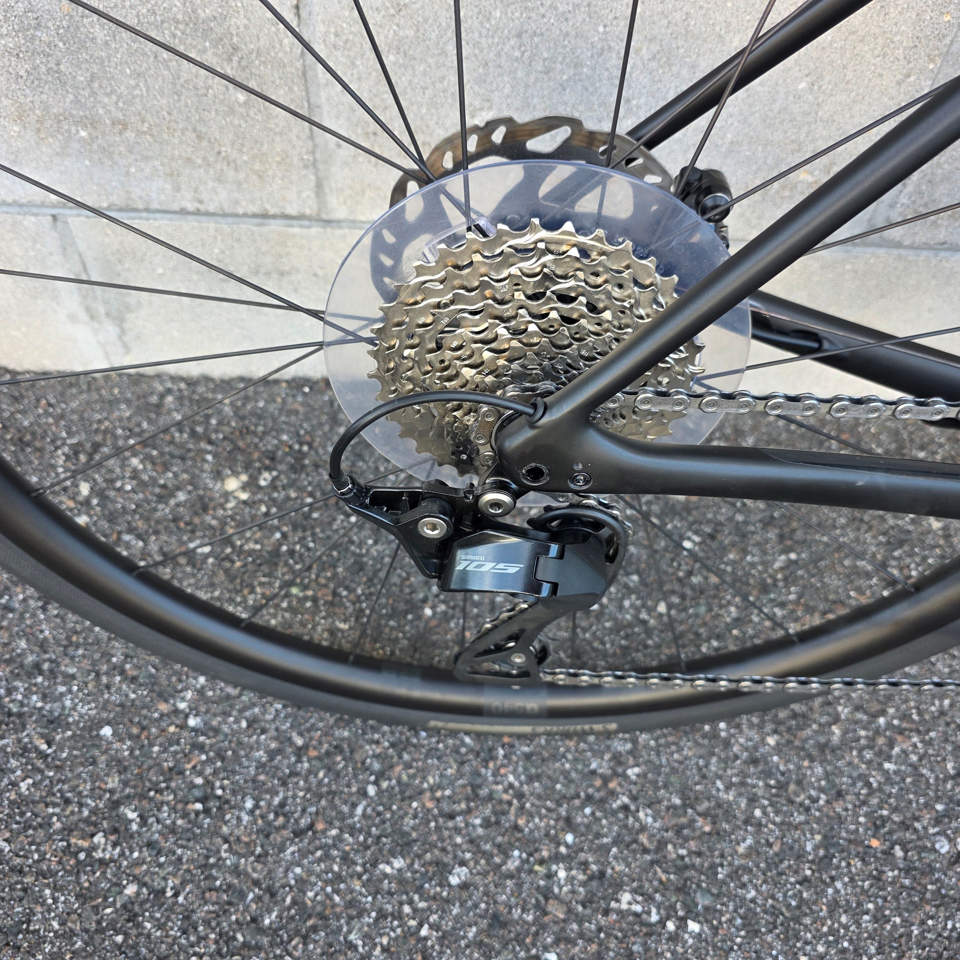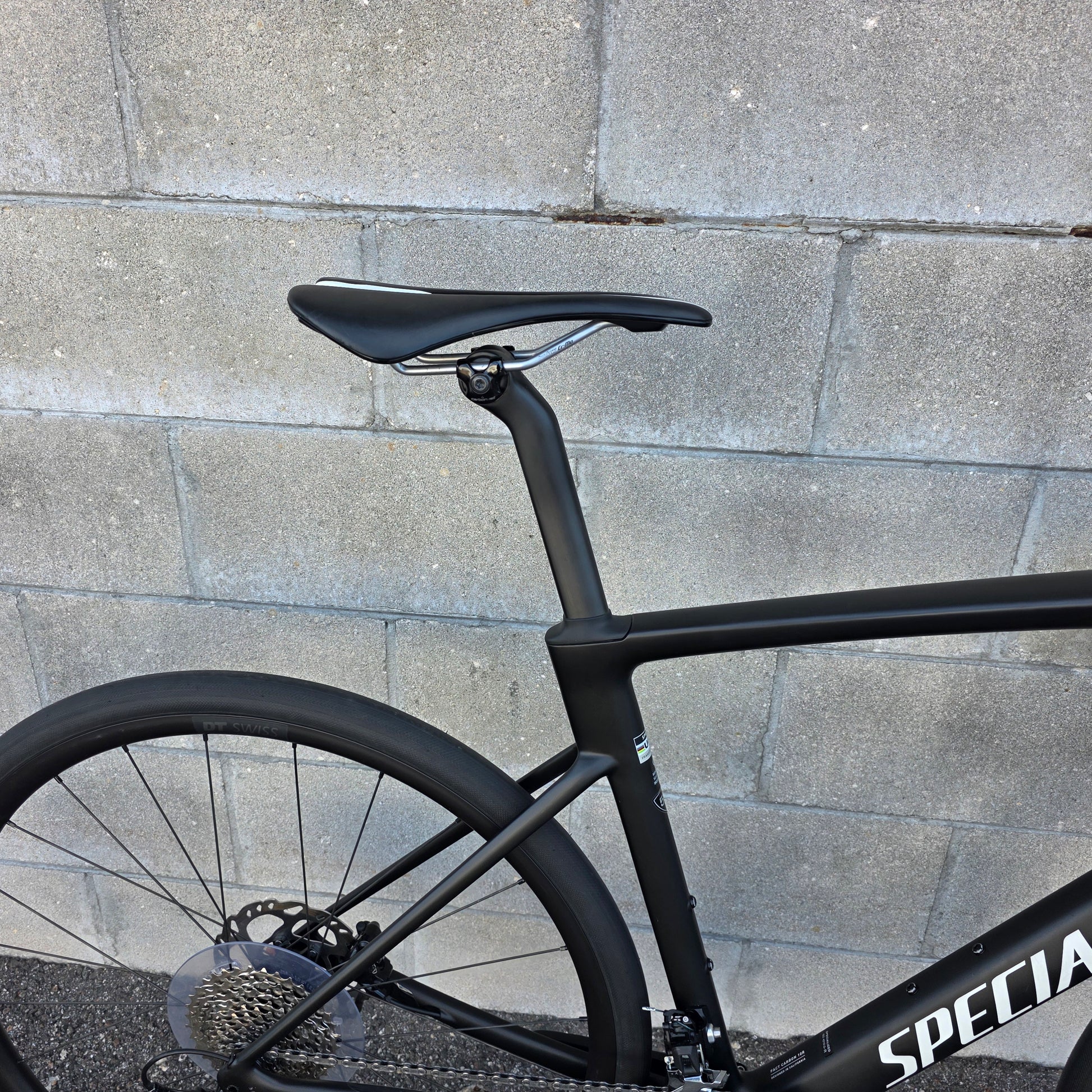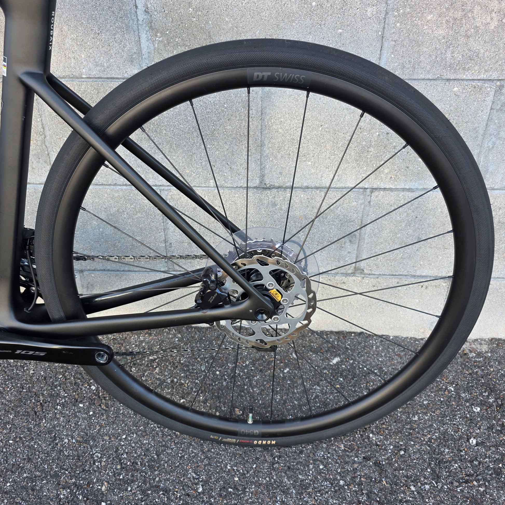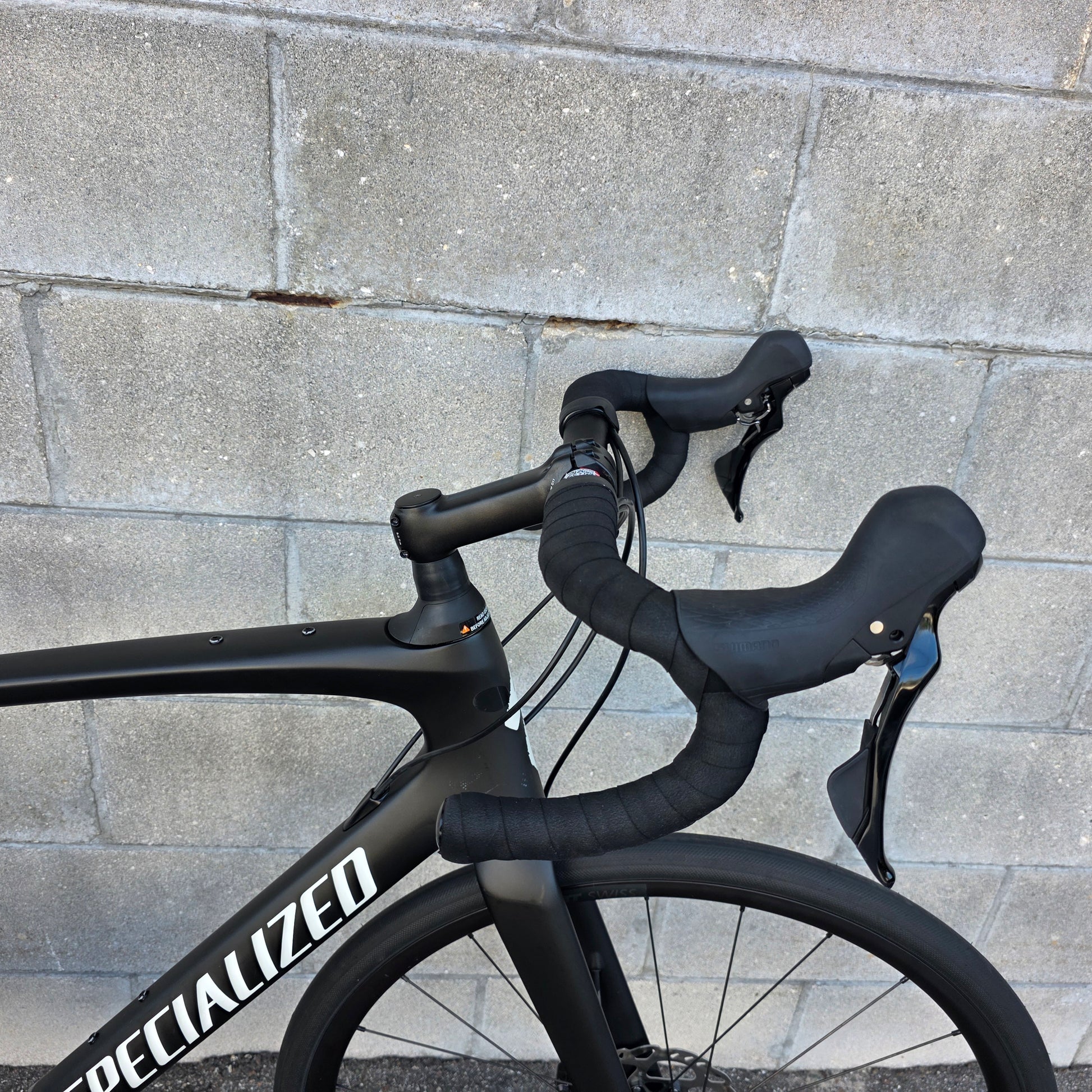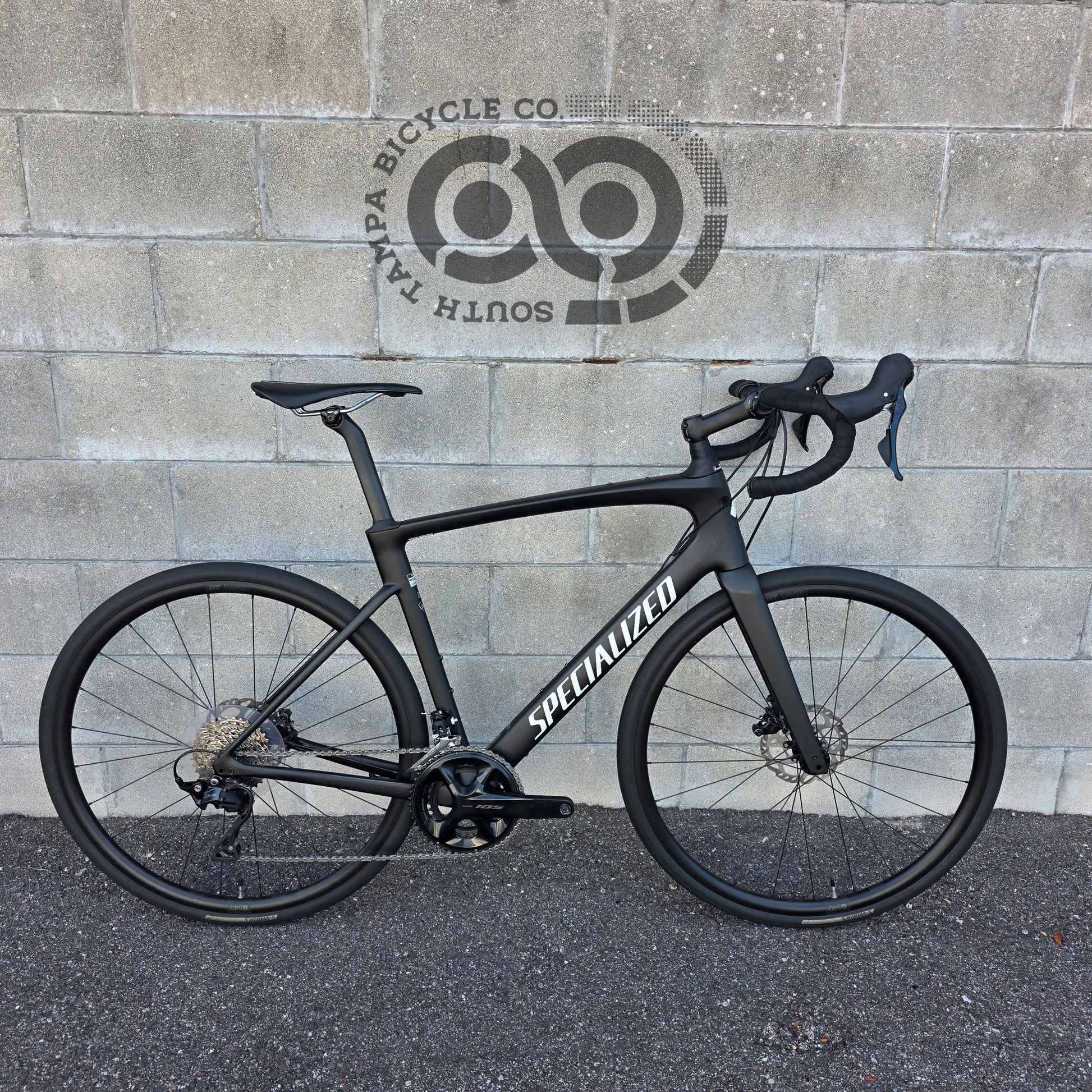 Shimano 105 groupset 12 speed, 50/34 cranks, 11-36 cassette, hydraulic brakes, Specialized Hover drop bars with rise, S-works Mondo 32c tires.