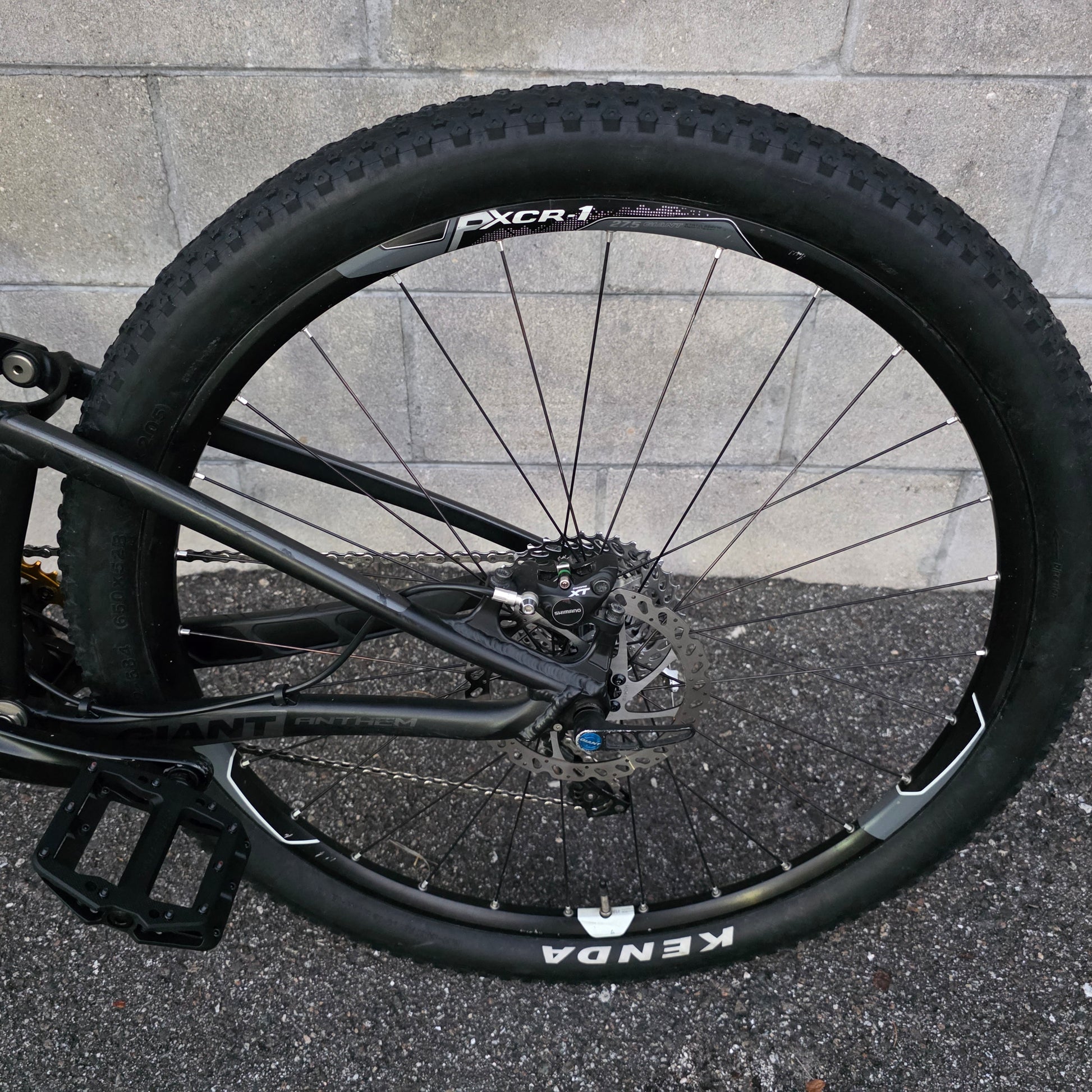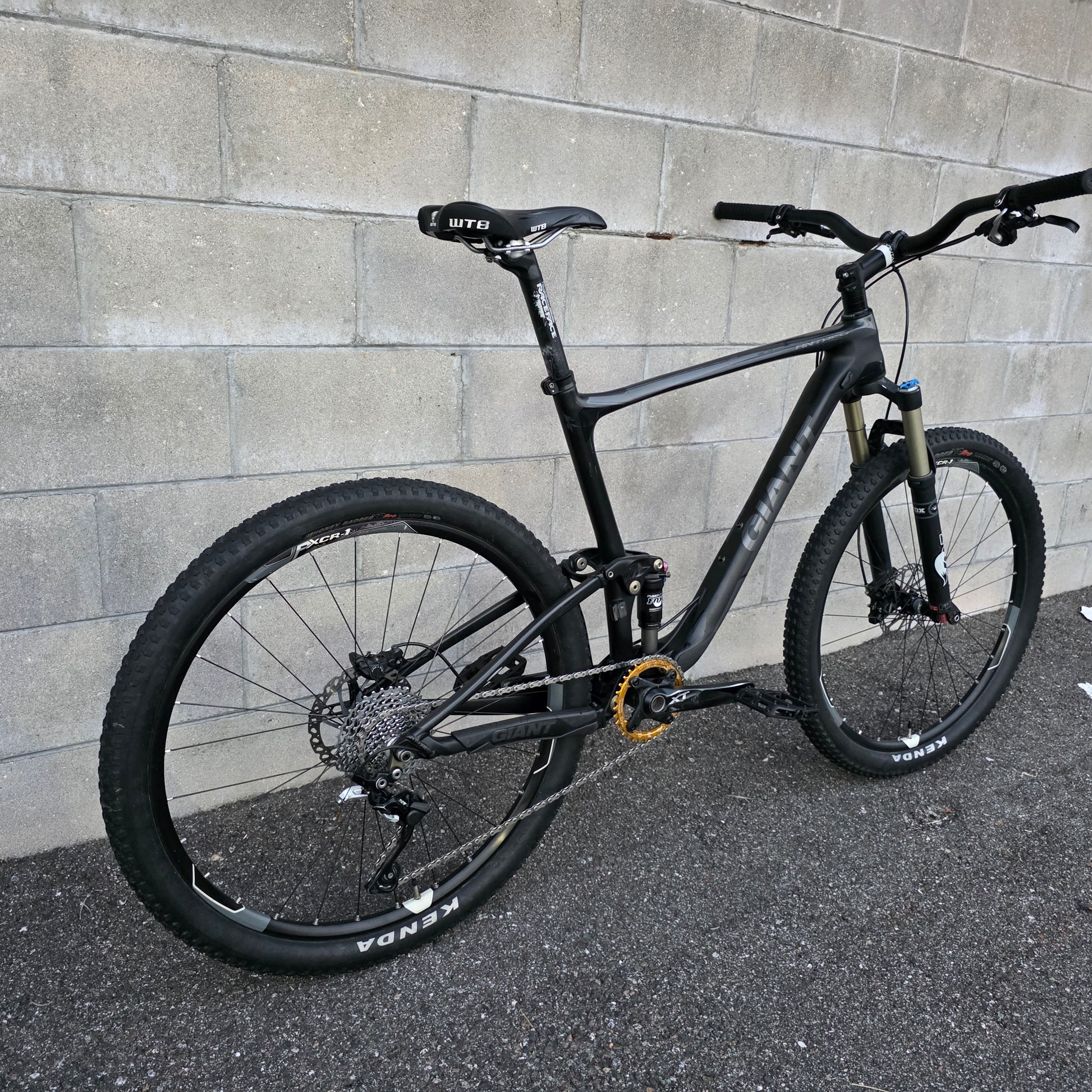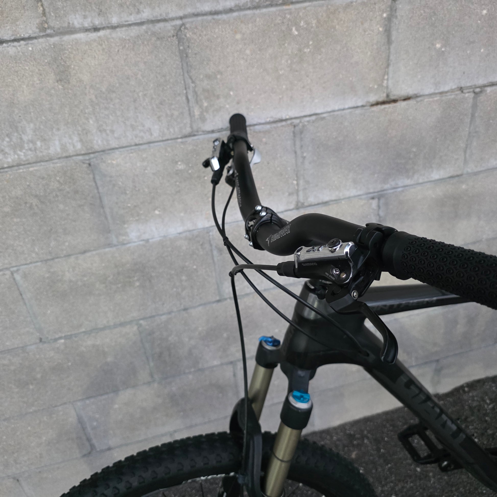 Fox suspension. Shimano XT 1x drivetrain and brakes, Kenda tires, tall upright stem and riser handlebar.