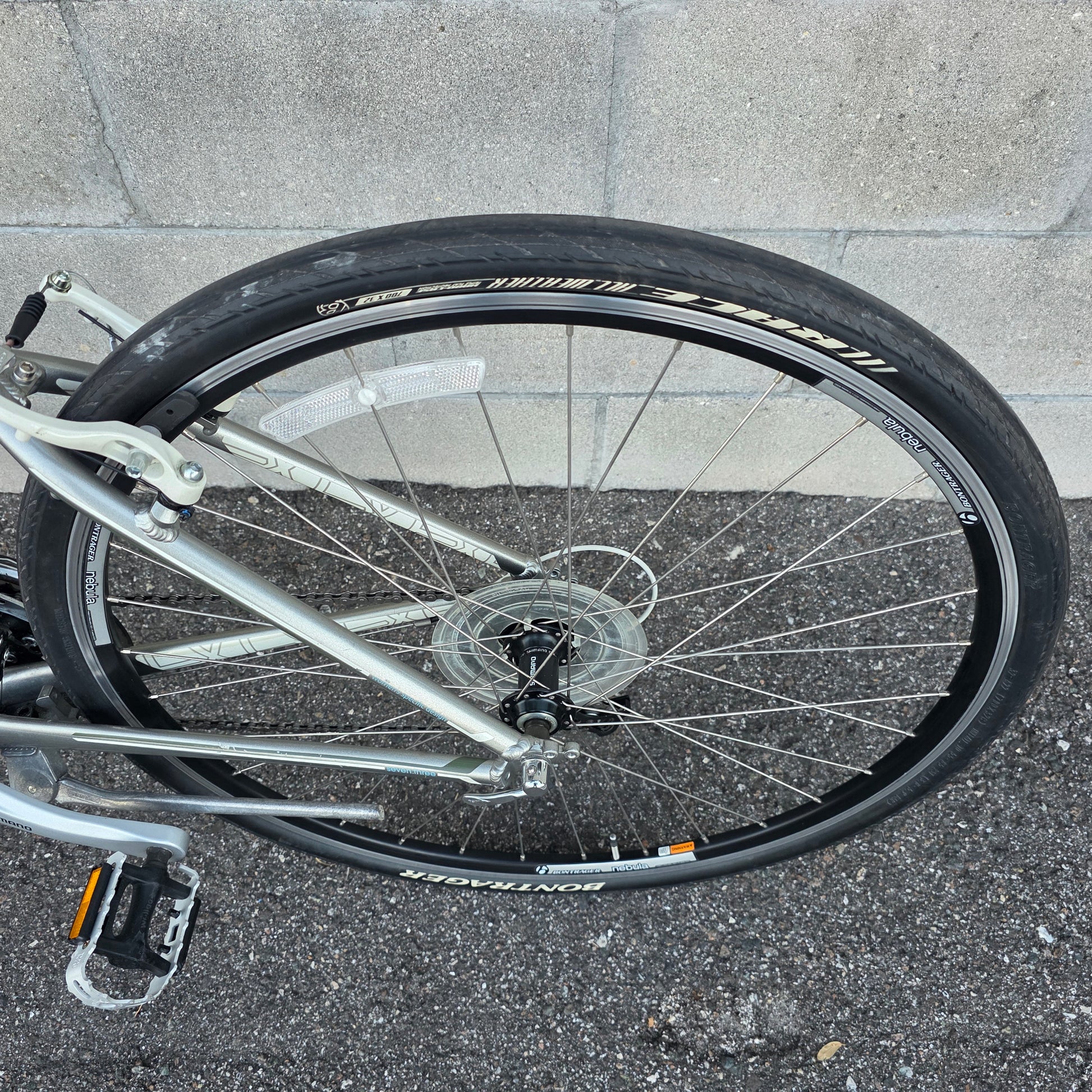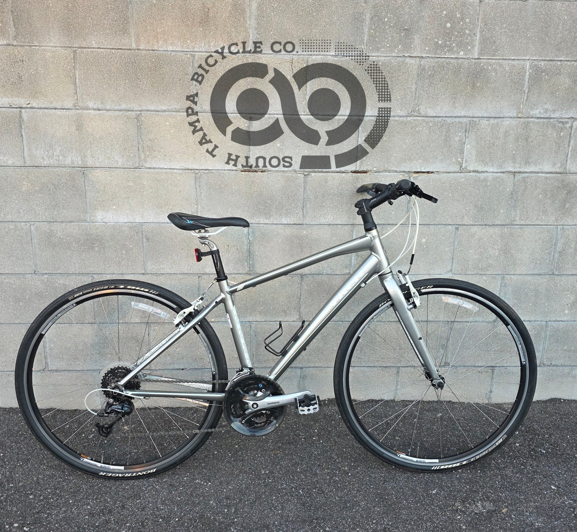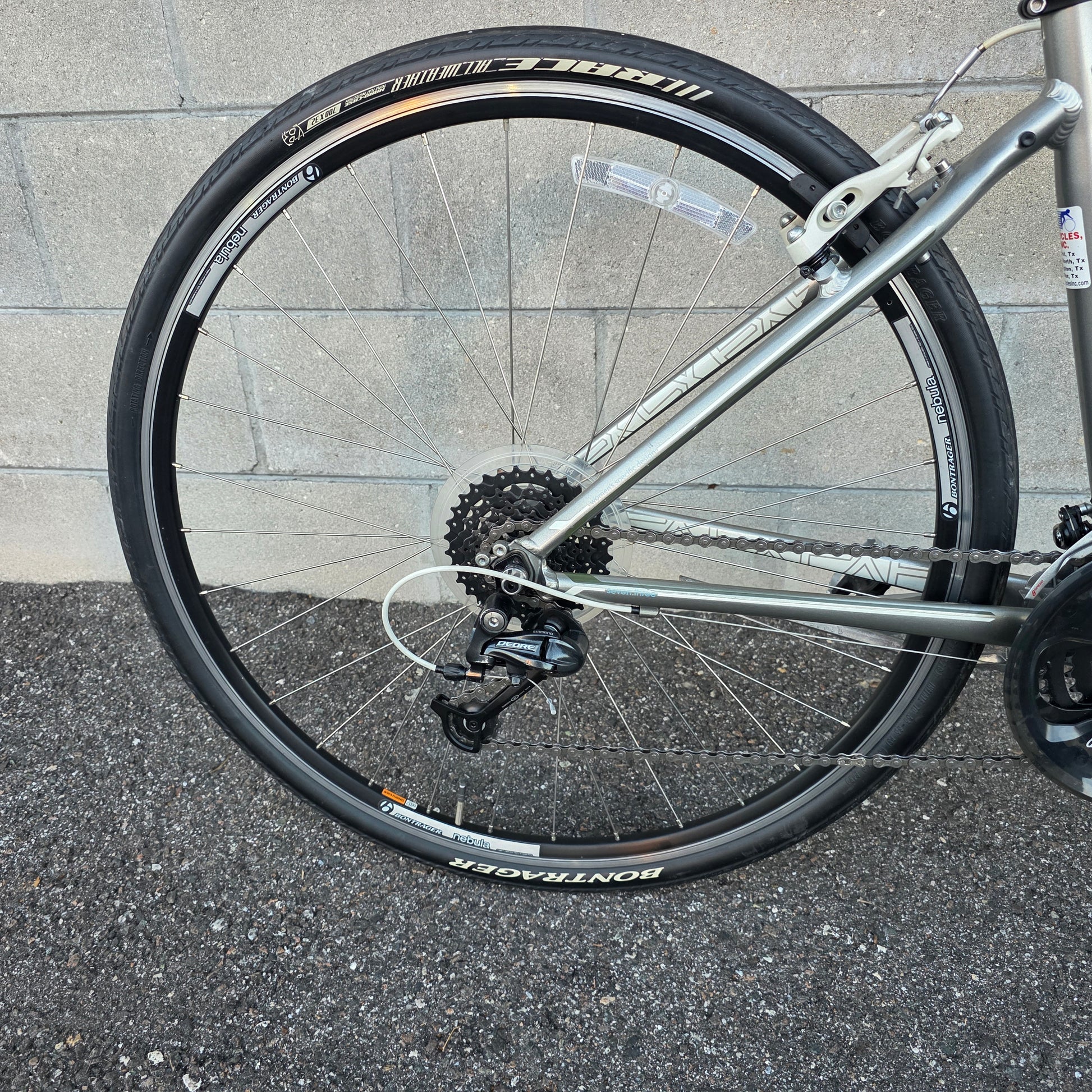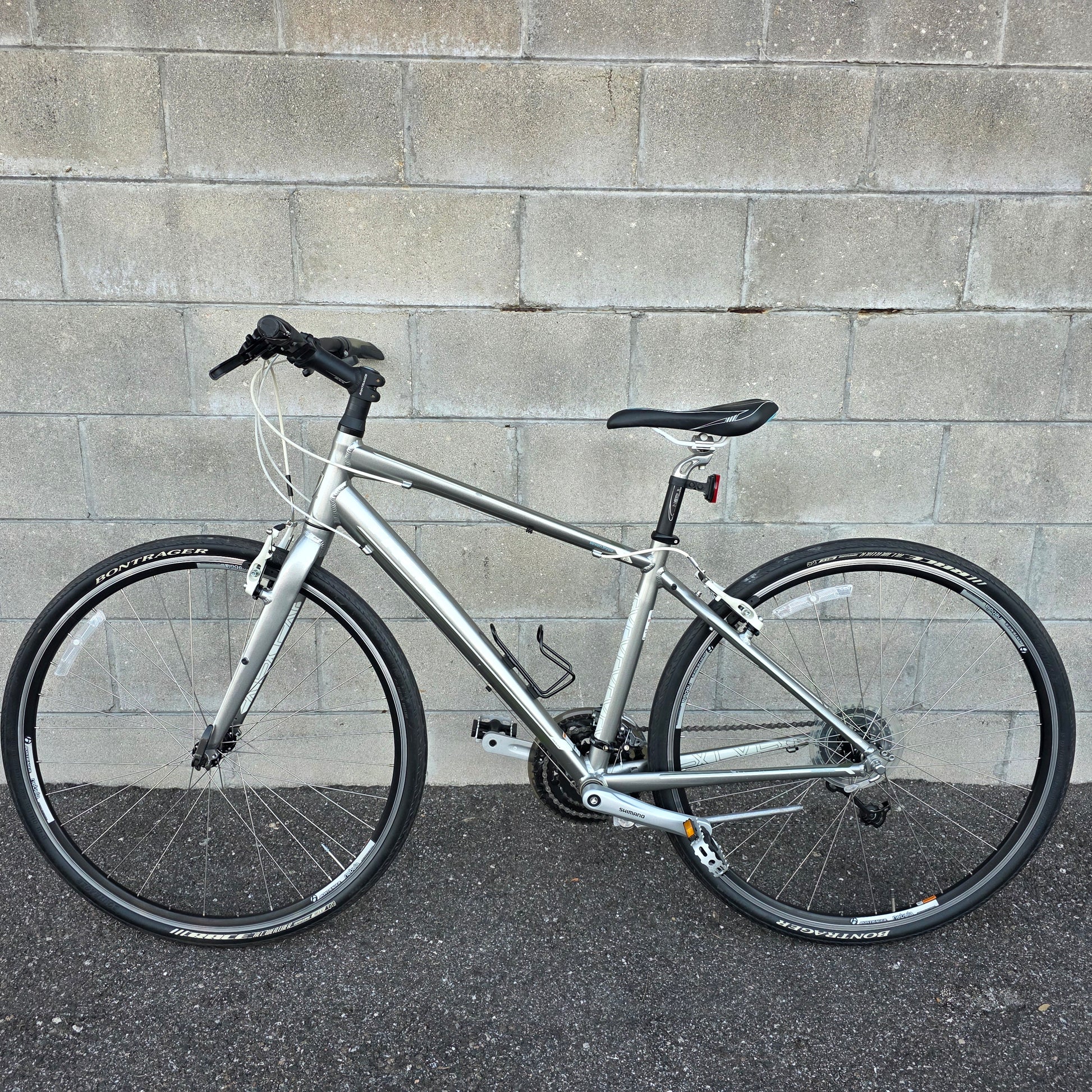 Lightweight alloy frame w/ 24spd Shimano drivetrain, Ergonomic gel saddle and hand grips for comfort, 700c wheels w/ 700x32c tires. Great bike all around!